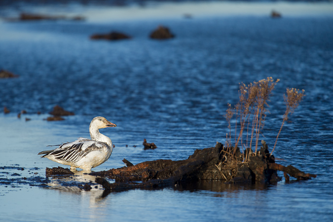 I had come to Bombay Hook looking for wildlife – Red Foxes and Snow Geese in particular, but the landscapes were gorgeous. The light doesn’t for anyone though. After spending some time capturing some of the landscapes, I started to drive around the refuge. I had missed the big blast-off of geese when I captured the early landscapes, but there were a couple of geese who hung around on the refuge. Most depart for the day to feed in various fields and water around the area. This was one Snow Goose that did stay around.