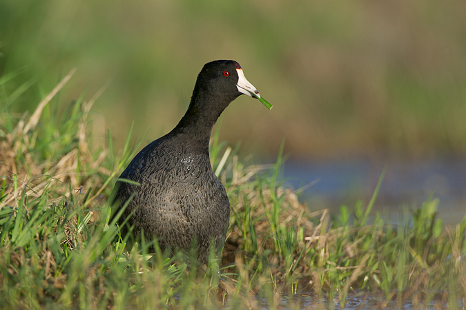 The signs of spring are just around the corner here. The American Coots are in their full breeding splendor. For them, it’s not much of a change. They gain sharper, crisper feathers and they develop a red patch where their bills meet their foreheads. The pair I photographed seemed to think they were cows and got out of the water to munch on some grass beside me.