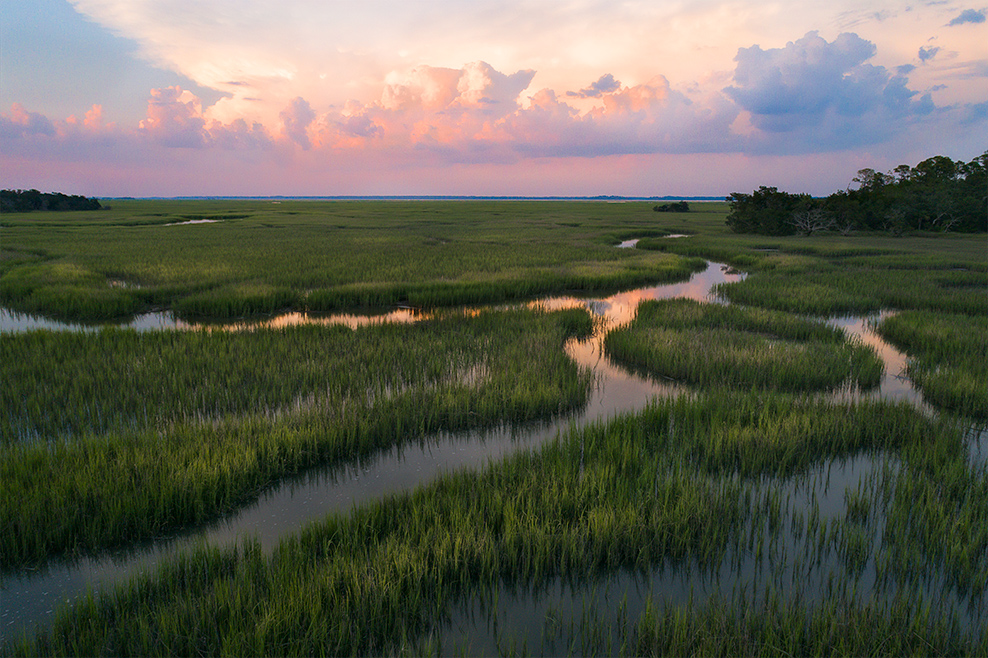 The sky is aglow after sunset over the saltmarshes of Beaufort County, South Carolina.