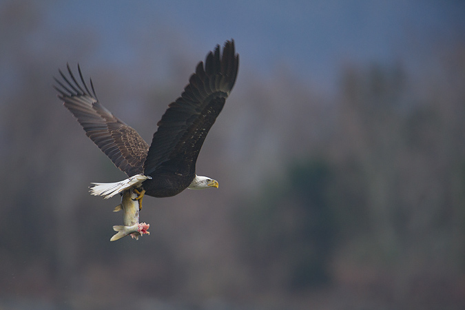 So you have a limited range of view where the background are clean. If you do get an eagle in this area of the background, it brings us to the second major problem: the fish that the eagles are here for. The reason the eagles come here is that the dam opens up periodically. When it does, fish pass through the turbines and many of them are cut up making them easy pickings for the gulls and eagles that wait downstream. But the fish really get cut up and it just isn’t a good story to tell of an eagle catching a cut up fish.